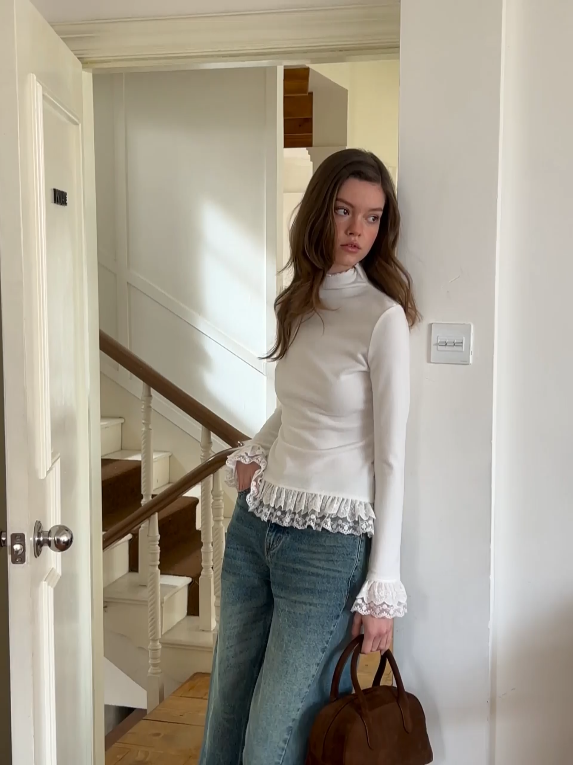 Haut à manches longues et col montant orné de dentelle blanche pour femme