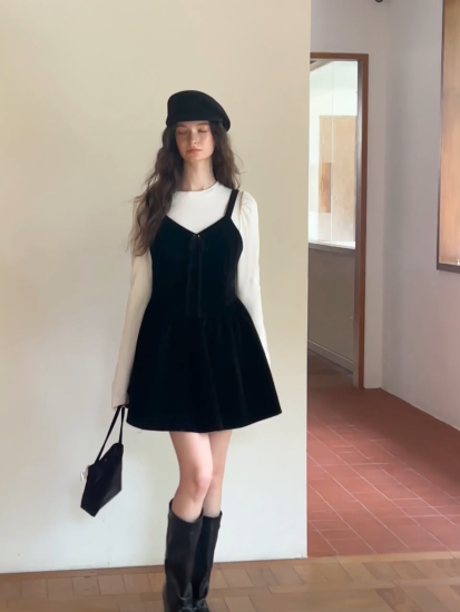 黒のベルベットのピナフォアドレス、フロントタイと調整可能なストラップ付き