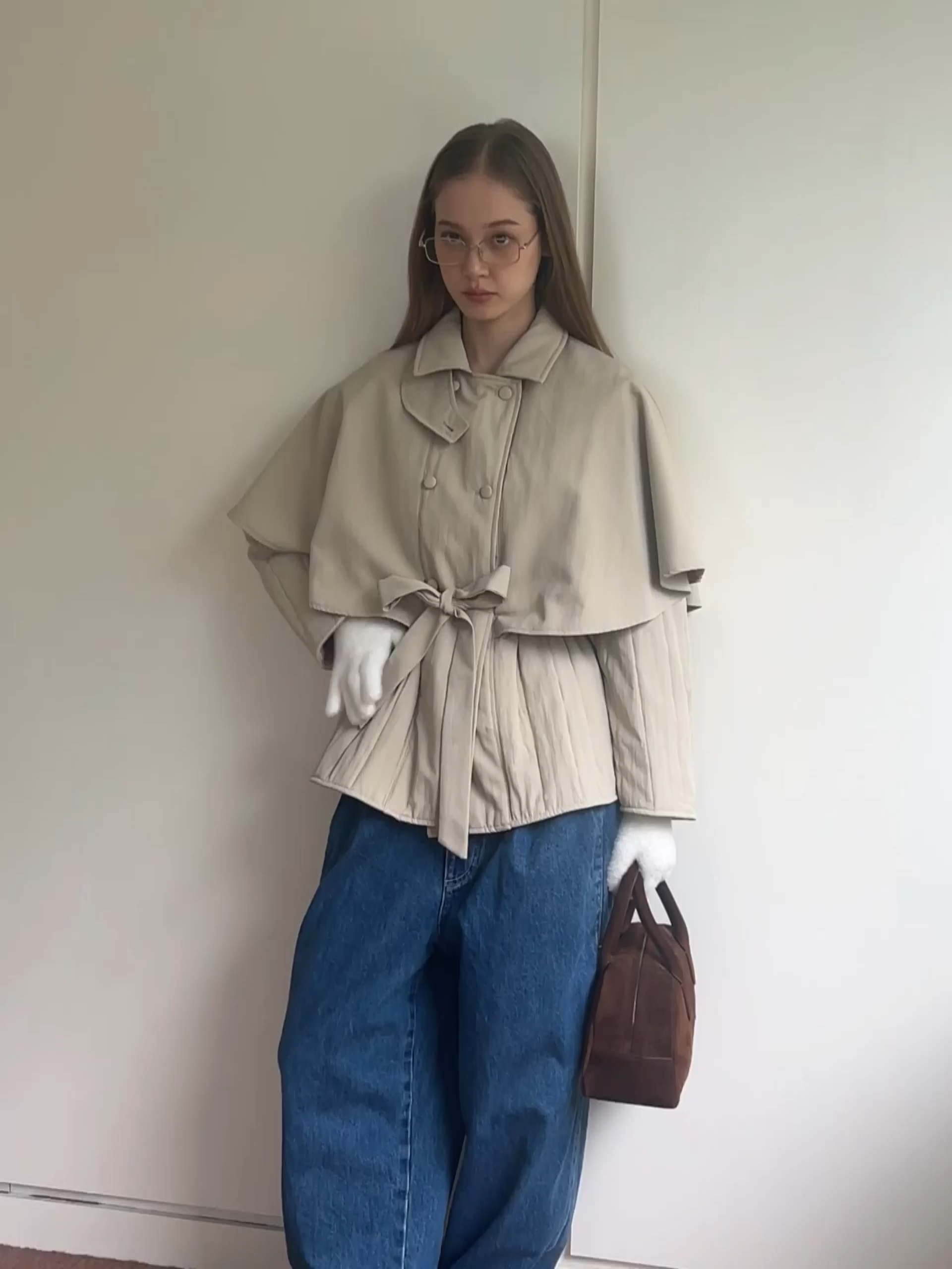 여성용 벨트와 케이프 슬리브가 있는 트렌치코트