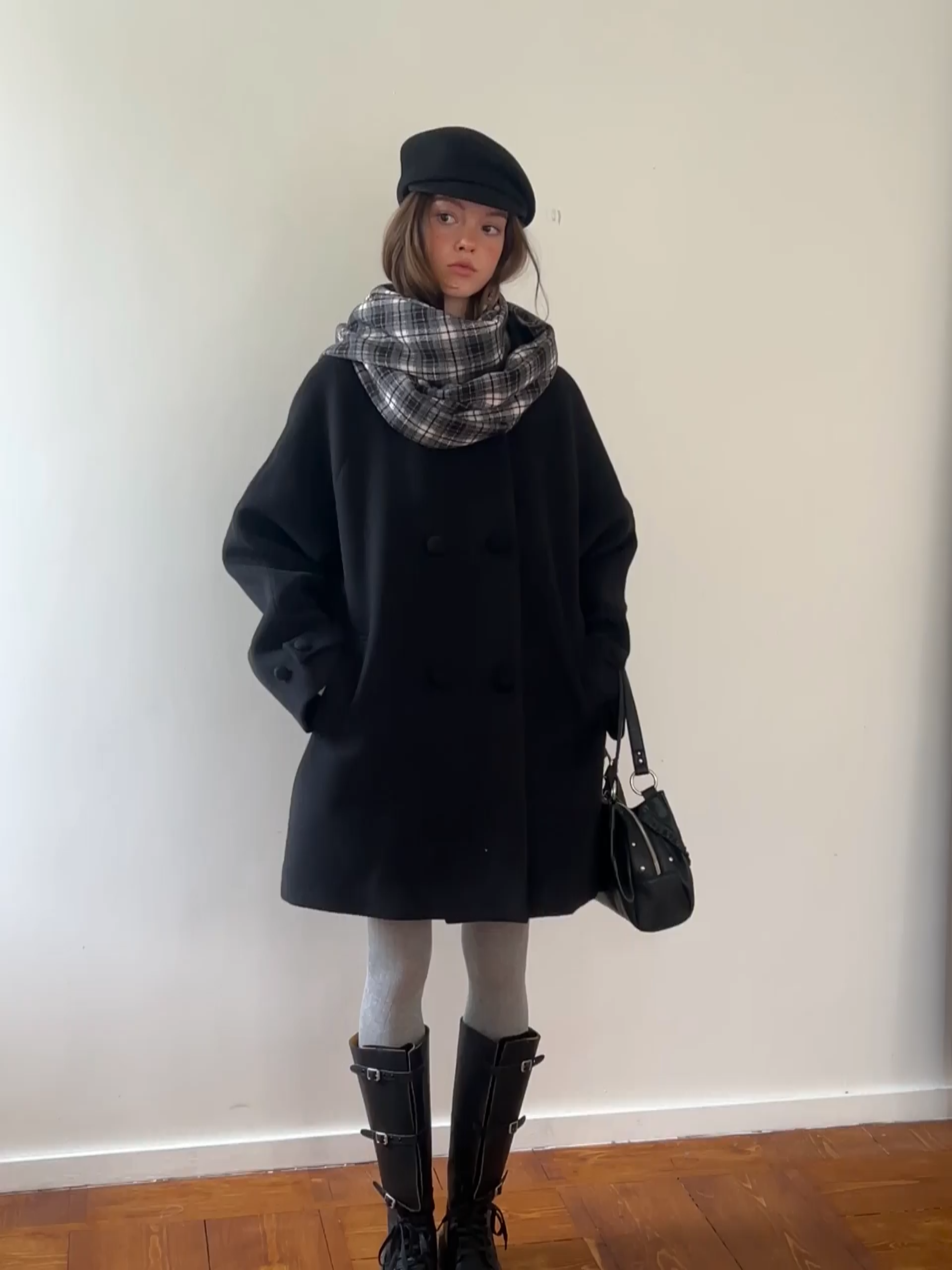 여성용 블랙 울 코트와 플레드 스카프 세트