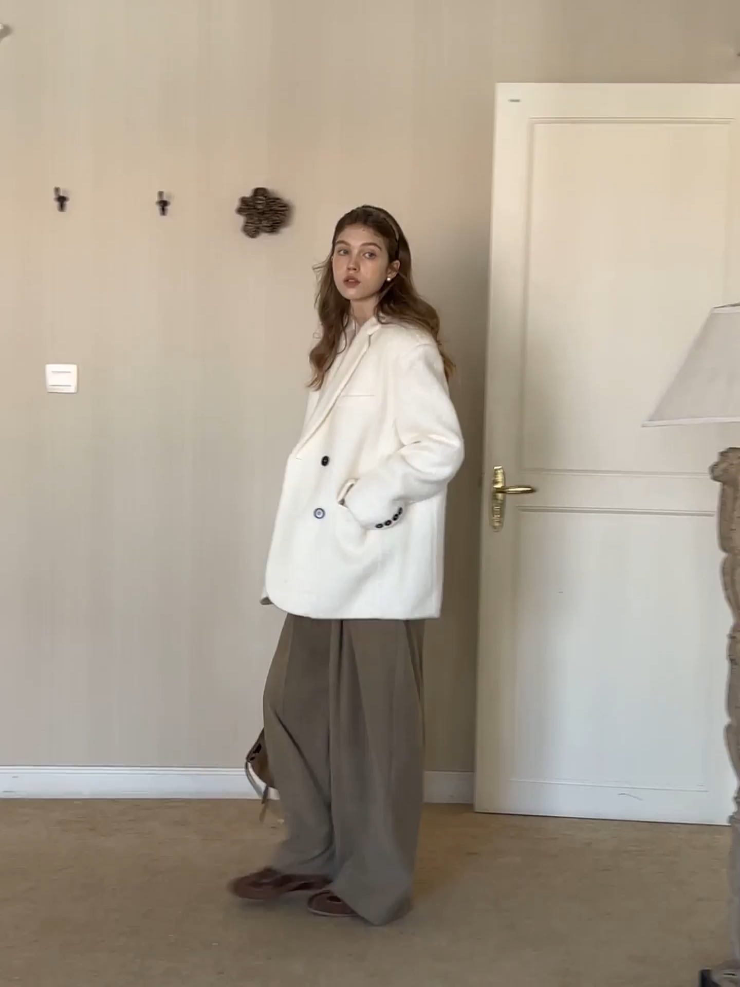더블 버튼이 달린 세련된 화이트 울 블레이저 코트