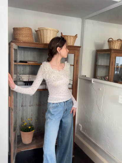 Polka dot long sleeve top with ruffled neckline