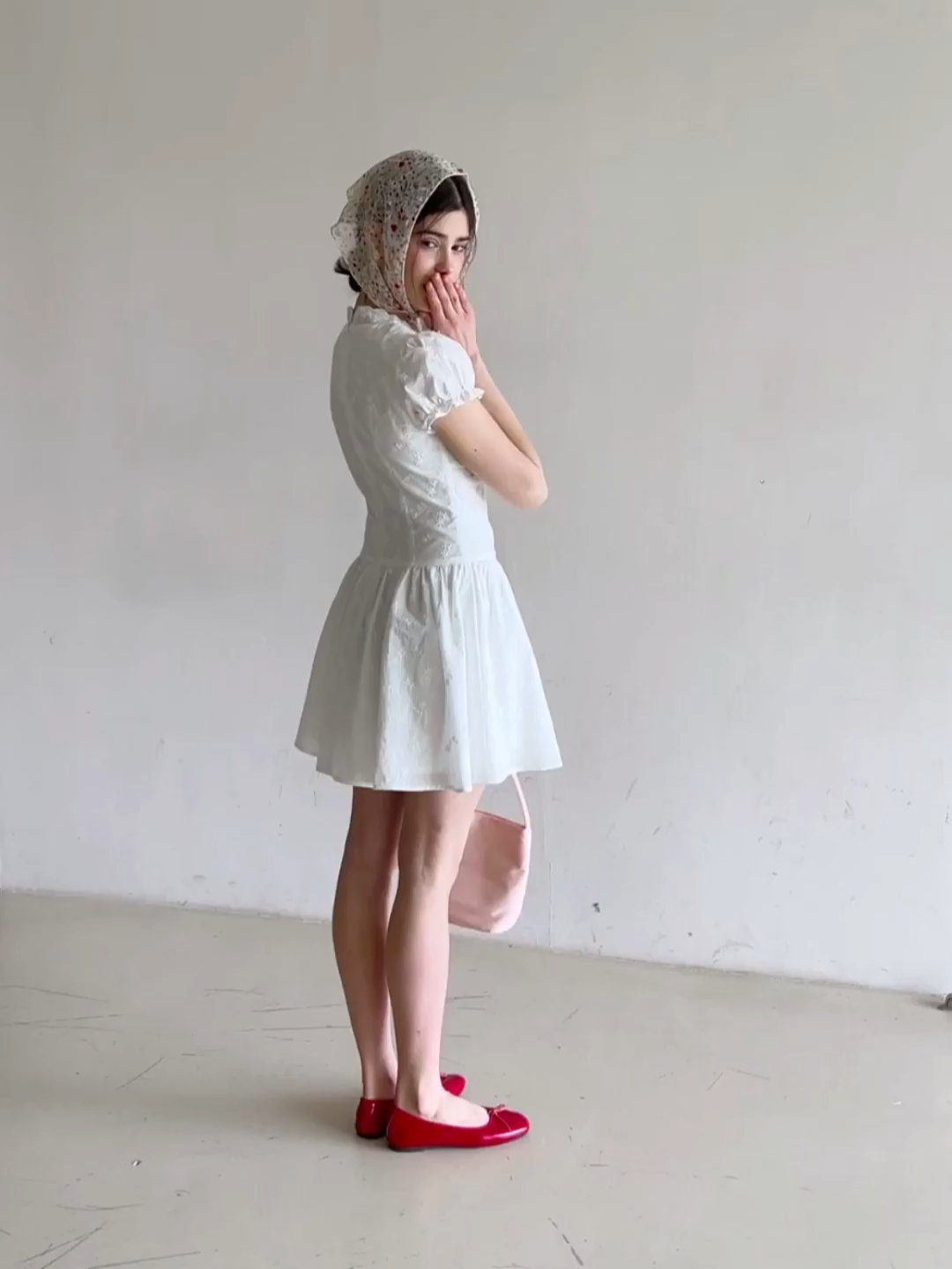 Short dress with puff sleeves and scalloped neckline
