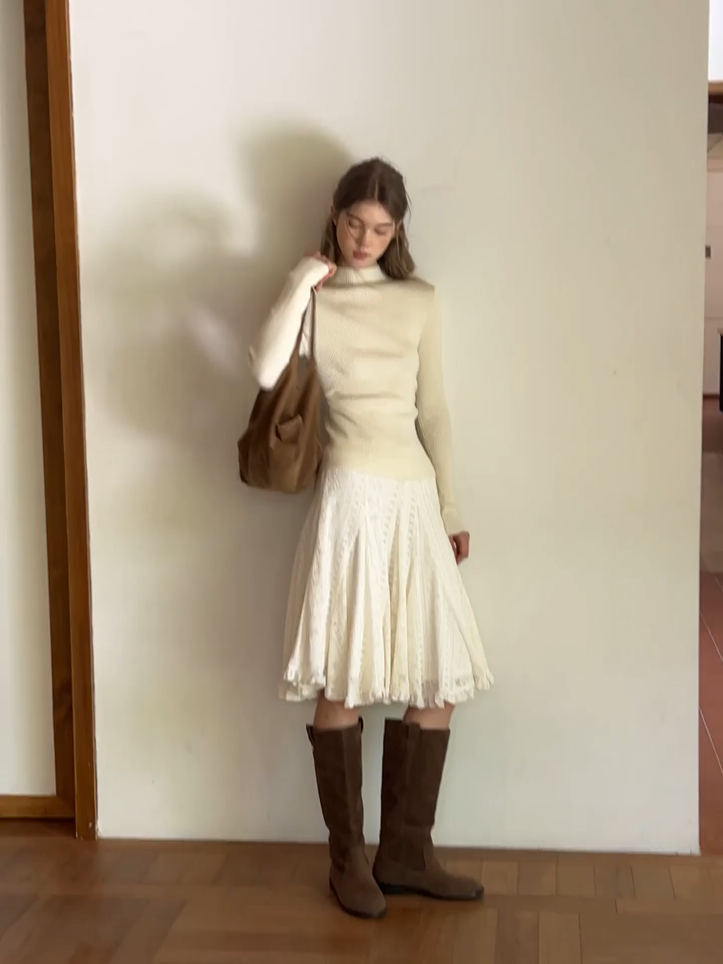 女士白色蕾絲褶襉加絨半身裙